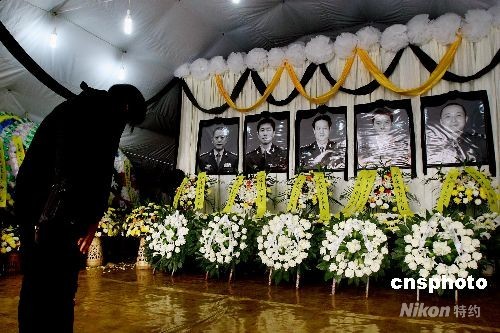 6月13日,成都軍區(qū)陸航團(tuán)在鳳凰山機(jī)場(chǎng)搭設(shè)靈堂,悼念在汶川大地震救災(zāi)行動(dòng)中失事直升機(jī)上5位遇難機(jī)機(jī)組人員。 中新社發(fā) 劉新 攝
