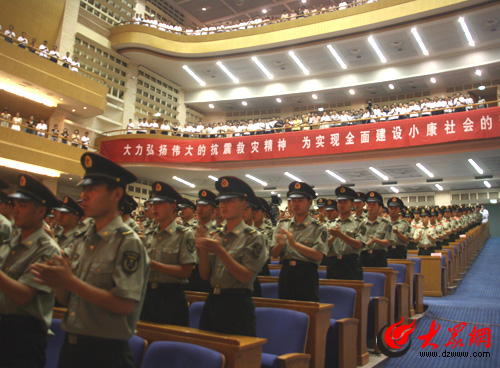 大眾網(wǎng)濟(jì)南6月23日訊 今日上午,抗震救災(zāi)英模事跡報(bào)告會(huì)在山東會(huì)堂舉行,報(bào)告團(tuán)6名成員報(bào)告了他們在抗震救災(zāi)中的感人事跡。圖為英模入場時(shí)全體起立鼓掌歡迎。