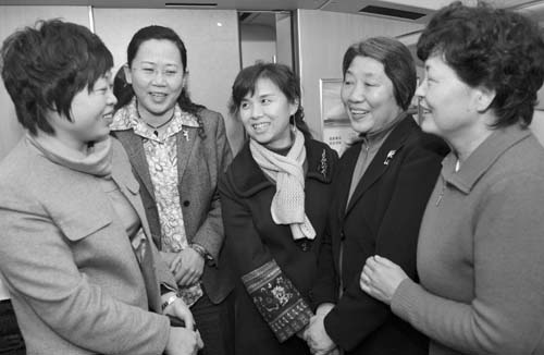 出席十一屆全國人大二次會議的住魯全國人大代表袁敬華、高明芹、鄧寶金、陳玉蘭、董鳳華(自左向右)聚在一起,熱烈討論女代表如何更好地履行自己職責的話題。