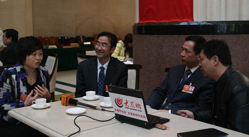 三名全國人大代表——齊魯醫院副院長孔北華(左三)、臨沂市人民醫院院長尹傳貴(左二)和山東夏津縣特殊教育學校校長袁敬華(左一)接受本網與大眾日報、半島都市報聯合采訪