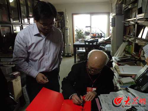 這是記者在中石先生書房用鏡頭記錄下的見聞,或許從我們的照片中,更能解讀出先生的博學與勤奮。圖為歐陽中石在大眾網嘉賓訪談簿上簽名。