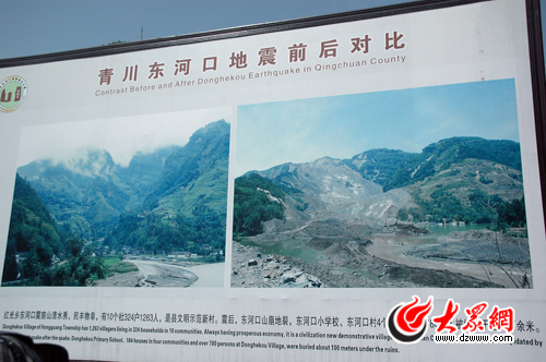 大眾網(wǎng)青川訊(特派記者 趙爾印)青川縣關(guān)莊鎮(zhèn)紅光鄉(xiāng)東河口現(xiàn)已不復(fù)存在,“天崩地裂”仿佛就是為描述這里曾經(jīng)發(fā)生的一切而造。據(jù)當(dāng)?shù)赜浾咝苘饺亟榻B,山腳下東河口村原有1263人,在2008年5月12日14時28分僅有80秒的瞬間里,4個社的780余父老鄉(xiāng)親沒來得及呼救,沒來得及吶喊就被無情掩埋在百多米厚深體崩塌的堆積體下……