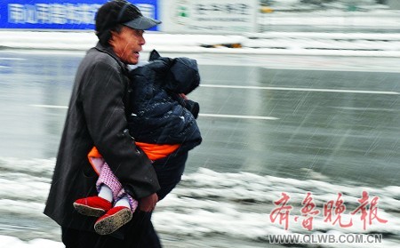 ▲老人懷抱小孩冒雪趕路。 郭建政 張曉鵬 攝