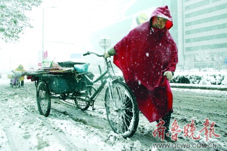 大雪來(lái)了,遍布于城市各個(gè)角落的小商小販們,為了生計(jì)不得不頂風(fēng)冒雪、腳踏泥水,賣早點(diǎn)、賣菜、賣報(bào)、賣地瓜……他們的勤奮,雖為謀利卻讓人敬佩,他們的堅(jiān)守,雖不起眼卻讓人動(dòng)容。他們,讓這個(gè)充滿寒意的城市多了些生機(jī)和希望。