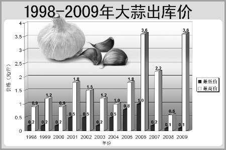 周雪峰說,2007年,新蒜收購價是每斤0.8元—1.2元,蒜農掙錢了。但蒜商在冷庫儲存到2008年春天,大蒜創出4分錢一斤的低價,蒜商賠慘了。2008年,新蒜收購價每斤0.2—0.5元,蒜農也賠錢了,儲存到2009年春天,蒜價只有0.1元多一斤,蒜商又賠錢了。今年新蒜的收購價剛開始是每斤1元多,漲到最高價是每斤3.9元左右。