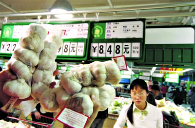 2009年11月29日,北京,市民在超市里選購大蒜。前一陣北方雨雪天氣之后,菜價驟然上漲,其實各種農產品中,真正的漲價冠軍還不是蔬菜,而是并不起眼的大蒜,相比去年的價格低點,目前干蒜的批發價已經上漲了40倍左右,這個漲幅可是比股市上最牛的牛股還厲害,并且大蒜的交易還在持續火爆。在這波行情中,那些手頭握有幾百噸、上千噸存貨的商人大賺特賺。