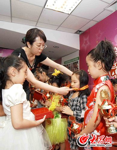 生活日報文娛編輯室主任張麗給寶貝掛獎牌時小心翼翼,關愛與呵護不言而喻