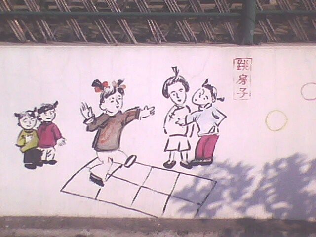 跳房子是一種世界性的兒童游戲。在電影里,十八世紀的歐洲曾經有過。在現實生活中,二十世紀的中國也曾經有過。跳房子也叫跳格,這是過去女孩子們經常玩的一種游戲。用一只沙包(或者一塊瓦片)作為游戲的輔助物,先把沙包扔到指定的地點,然后蹦蹦跳跳、飛檐走壁、穿房越脊,把沙包拾回來便大功告成。有時一邊玩她們還一邊唱:“正月十五黑咕隆咚,樹枝不動刮大風,刮得面包吃牛奶,刮得火車上天空……”