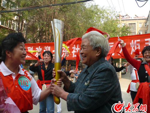 “這是上午剛剛在火炬傳遞儀式上用過的‘如意’火炬,大家都傳傳!睘榇蠹規怼叭缫狻钡氖巧鐓^黨總支書記田寶明,她剛剛作為十一運會濟南火炬傳遞的102號火炬手參加了上午的火炬傳遞活動。當田寶明將手中的“如意”火炬傳給社區居民李玉英老太時,人群中迸發出熱烈地掌聲和歡呼聲。