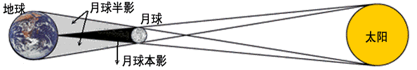 日全食原理 日全食必須太陽、月亮、地球在一條直線的時才能發生。同時,月亮還必須在新生相的位置。在日全食的時候,月亮在地球的影子分為兩部分,中心的地區叫做本影,外面的區域叫做半影。只有處在本影的位置才能看到日全食;在半影區域的位置能看到日偏食。