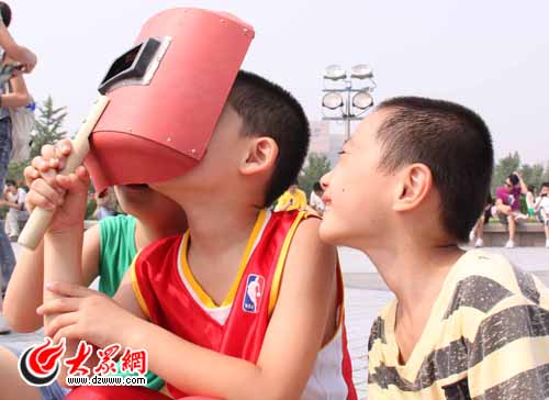 一位市民用自制的五環形狀的小孔,在一位小朋友身上形成一個個“日牙”