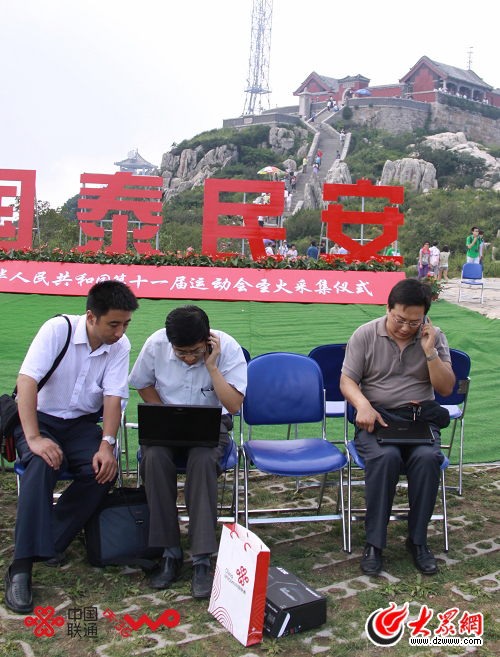 7月31日,全運會圣火采集報道組提前來到泰山之巔,同時趕到的是聯(lián)通泰安分公司工作人員。為了這次圣火采集直播,泰安聯(lián)通移動建設部、產(chǎn)品創(chuàng)新中心、設備中心三個部門全部派出骨干力量上山調試網(wǎng)絡。移動建設部宋慶杰主任帶領近十名工作人員來到圣火采集儀式現(xiàn)場,工作人員打開3G無線上網(wǎng)本進行調試,產(chǎn)品創(chuàng)新部劉倫主任和郭冠軍、李新春在整個直播期間一直在記者直播處附近,隨時待命處理突發(fā)事故,但網(wǎng)絡一直處于暢通,并沒有出現(xiàn)任何狀況。
