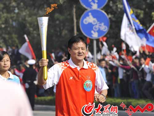 10月15日上午,中華人民共和國第11屆運動會濟南市火炬?zhèn)鬟f活動在濟南龍奧大廈南門前隆重舉行,省委書記姜異康、省體育局局長張洪濤、濟南市體育局局長初偉分別展示火炬,乒乓球國手李曉霞接過初偉手中的火炬完成了第一棒火炬的傳遞。10:20分,火炬?zhèn)鬟f從經(jīng)十東路轉向轉山西路,霍海峰總經(jīng)理身穿91號火炬手服裝,面帶微笑,神采奕奕,與90號火炬手張鎮(zhèn)交接時,雙方并肩相抱,致敬、慶祝,激動之情溢于言表。霍總高高舉起熊熊燃燒的如意火炬,健步向前,夾道歡迎的群眾揮舞著手中的五星紅旗、全運旗幟,為火炬手加油的吶喊聲此起彼伏,山東聯(lián)通方隊高喊“中國聯(lián)通,精彩在沃,聯(lián)通加油,霍總加油”。如意火炬所到之處,都變成了激情和歡樂的海洋。霍總從容地與第92號火炬手擊掌慶祝,順利完成了在本次火炬?zhèn)鬟f儀式上的使命。圖為:霍海峰在火炬?zhèn)鬟f中。郭劍 王玉君/攝影報道