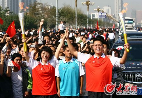 大眾網濰坊9月22日訊 今天,一個陽光明媚的金秋時節,濰坊市迎來了全運火炬,這也是火炬傳遞山東省第四站。上午九點,啟動儀式在濰坊市人民廣場舉行,有90名火炬手參加了火炬傳遞,傳遞路線主要在勝利街進行。第一棒火炬手是奧運冠軍林偉寧,有近10萬市民在道路兩側夾道歡迎火炬手,為他們搖旗吶喊。