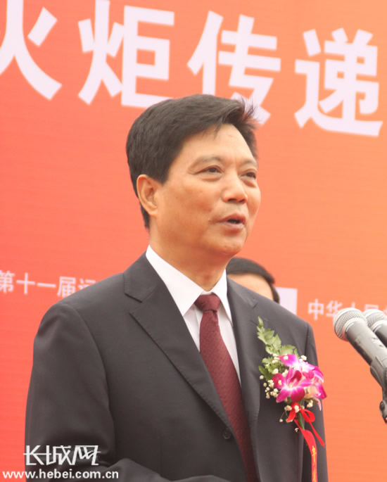河北省委副書記、省長胡春華(右)將火炬傳授給省體育局局長聶瑞平(左)。