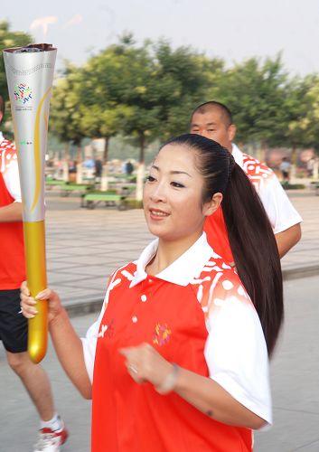 火炬手、全國(guó)健身小姐冠軍邱亞娟在進(jìn)行傳遞。