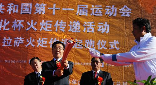 在經歷了13個省(區、市)的傳遞之后,第十一屆全國運動會的圣火于8月29日開始在西藏拉薩進行傳遞。29日早上,在拉薩布達拉宮門前的廣場上,彩旗飄揚,歌聲嘹亮,來自拉薩各界的群眾代表共 3000余人見證了全運圣火在雪域高原上的傳遞。