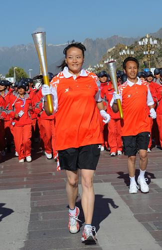 火炬手、著名登山運動員吉吉(前)在火炬傳遞中