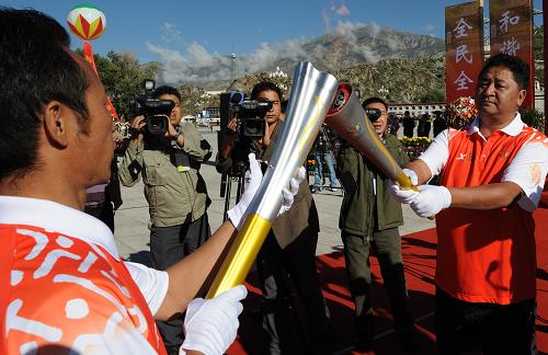 8月29日,圣火護衛人員尼瑪次仁(右)點燃西藏自治區黨委書記張慶黎手中的主火炬。當日,第十一屆全運會火炬在西藏拉薩進行傳遞。新華社記者格桑達瓦攝