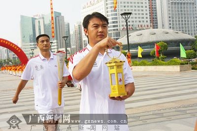 上午9點,廣西壯族自治區主席馬飚點燃主火炬,將主火炬傳遞給自治區體育局局長容小寧。隨后,容小寧將火炬傳遞給奧運會舉重冠軍陸永。隨著馬飚宣布火炬傳遞活動開始,陸永手持主火炬分別點燃了奧運會跳水冠軍李婷和世界摔跤冠軍覃和手中的副火炬。三名火炬手帶領五路縱隊,從五象廣場出發,沿民族大道進行火炬傳遞活動,并登上汽車向沿途的人們展示火炬,最終順利到達民族廣場,圓滿完成本次火炬傳遞活動。