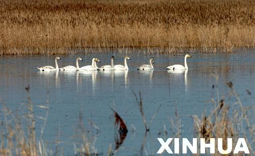 幾只大天鵝游弋在黃河三角洲濕地保護(hù)區(qū)內(nèi)蘆葦蕩中(12月3日攝)。新華社記者范長國攝
