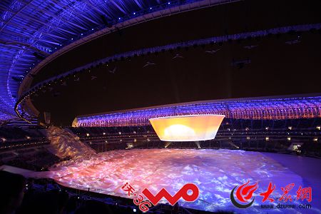 滾滾黃河東流入海,黃色的河水和藍色的海水涇渭分明成為山東獨有的黃河入海奇景。今晚,全運開幕式上,再現了這一壯美的景觀。顏色是由燈光投射形成,那么滾滾的波濤是如何完成的呢? 原來,為了凸現“黃河入海”的壯觀景象,1520名來自“開國大典紅一師”的官兵手持84塊大小不一的綢布,上下舉動,在幾分鐘的時間內抓牢綢布,蹲下站起四五十次,制造出波濤洶涌的壯觀一幕。 84塊綢布,最大的一塊長23米,寬10米,需要18名官兵全力合作才能拉起來,在風的阻力下,20 多公斤重的大綢布舞動起來十分耗費體力。而更難的則是這些綢布必須“嚴絲合縫”,尤其是邊、角等環節不能出現任何閃失。(大眾網十一運開幕式特派記者 李冉 陳宏發 楊博)