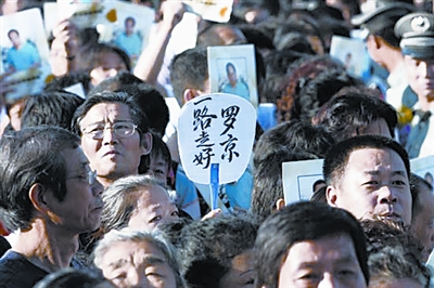 清晨開始,來自各方的群眾自發(fā)前往八寶山悼念羅京,長達百米的隊伍蜿蜒而至公墓大門之外,數(shù)百只花圈擺滿靈堂兩側(cè),寄托著各方人士對羅京的緬懷之情。有白發(fā)蒼蒼步履蹣跚的80歲老人,有在父母帶領(lǐng)下、牙牙學(xué)語的孩子,有從小與羅京一起學(xué)習(xí)的同學(xué),有羅京高中母校的代表,有曾經(jīng)受過他指導(dǎo)的實習(xí)生,還有專程從美國趕來送羅京最后一程的校友,很多人憶起與羅京生前的點滴黯然淚下。近萬人的哀悼隊伍井然有序,大家手持白菊,每七人一組向羅京遺體三鞠躬,為“國嘴”祈禱送行。