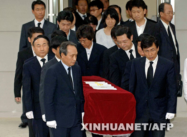 5月23日,在韓國首都首爾東南約430公里處的梁山,前總統(tǒng)盧武鉉的棺材被抬出醫(yī)院。
