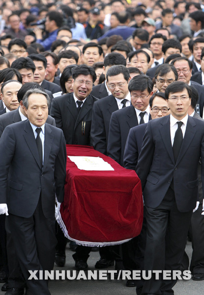 5月23日,人們抬著韓國前總統(tǒng)盧武鉉的棺木抵達金海市峰下村。新華社/路透