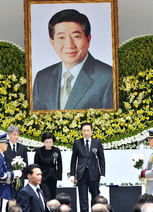 首爾,2009年5月29日 韓國為已故前總統盧武鉉舉行遺體告別儀式 5月29日,韓國總統李明博(右)和夫人向已故韓國前總統盧武鉉遺像獻花后返回座位。韓國各界當天上午在位于首都首爾市中心的景福宮舉行了規模盛大的前總統盧武鉉遺體告別儀式。 新華社/紐西斯通訊社