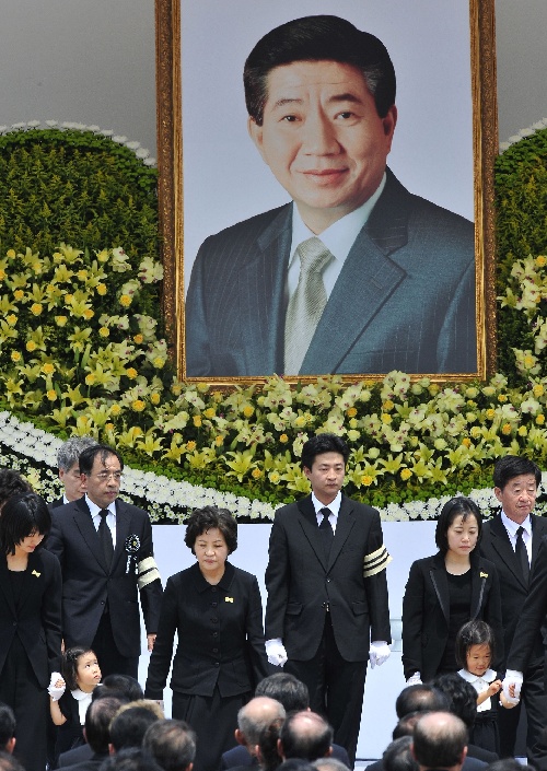 首爾,2009年5月29日 韓國為已故前總統盧武鉉舉行遺體告別儀式 5月29日,已故韓國前總統盧武鉉的遺孀權良淑(前排中)和子女等向盧武鉉遺像獻花后返回座位。韓國各界當天上午在位于首都首爾市中心的景福宮舉行了規模盛大的前總統盧武鉉遺體告別儀式。 新華社/紐西斯通訊社