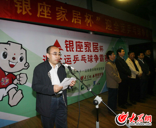 今天上午,由十一運(yùn)會組委會新聞宣傳部指導(dǎo)、大眾報業(yè)集團(tuán)大眾網(wǎng)主辦的“銀座家居”杯迎全運(yùn)乒乓球爭霸賽,在濟(jì)南泰山大廈拉開戰(zhàn)幕。