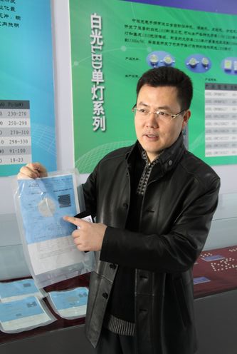 中微光電子公司首席運營官陳曉東展示最新的LED燈芯片技術。