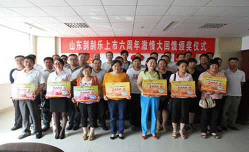 2013年9月1日至10月15日山東刮刮樂上市六周年激情大回饋活動期間,凡購買刮刮樂彩票單張中得100元及以上的彩友均有機會中得價值2000元山東一卡通一張,省福彩中心分別在9月16日、10月1日、10月16日進行三次抽獎。