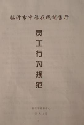 制度是管理的根本。沒有規(guī)矩、不成方圓,只有制定了完善的制度并認(rèn)真學(xué)習(xí)落實,才能規(guī)范員工行為,步調(diào)一致取得勝利。市中心根據(jù)銷售廳的工作性質(zhì),結(jié)合實際需要制定了《臨沂市中福在線銷售廳員工行為規(guī)范》,內(nèi)容包括銷售廳日常工作流程、服務(wù)形象、服務(wù)規(guī)范、崗位職責(zé)、服務(wù)細(xì)則、考勤制度、獎懲制度等,對銷售廳的管理服務(wù)工作進(jìn)行了具體的規(guī)定。通過組織員工學(xué)習(xí),讓他們明確了自己的職責(zé),統(tǒng)一了思想行為,提升了執(zhí)行力和服務(wù)水平。
