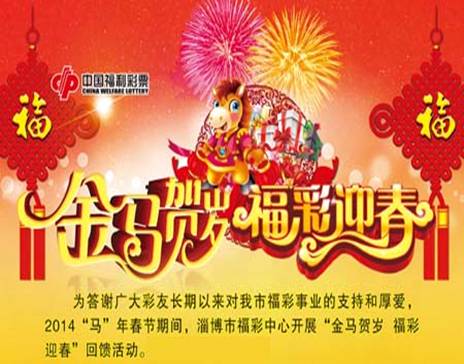 為答謝廣大彩友長(zhǎng)期以來(lái)對(duì)淄博市福彩事業(yè)的支持和厚愛(ài),2014年馬年春節(jié)期間,淄博市福彩中心針對(duì)電腦票隆重推出“金馬賀歲 福彩迎春”大型回饋活動(dòng)。