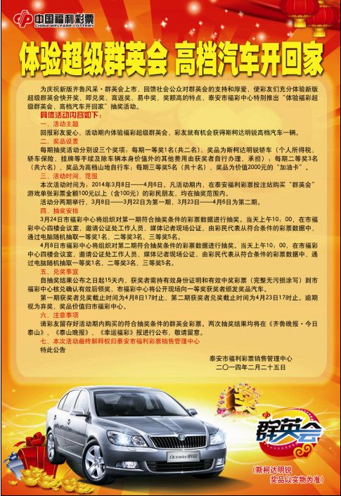 為回饋社會(huì)公眾對(duì)群英會(huì)的支持和厚愛(ài),使彩友們充分體驗(yàn)新版超級(jí)群英會(huì)快開獎(jiǎng)、即兌獎(jiǎng)、高返獎(jiǎng)、易中獎(jiǎng)、獎(jiǎng)?lì)~高的特點(diǎn),泰安市福彩中心特別推出“體驗(yàn)福彩超級(jí)群英會(huì),高檔汽車開回家”抽獎(jiǎng)活動(dòng)。市民在活動(dòng)期內(nèi)購(gòu)買“群英會(huì)”彩票,最高可獲得斯柯達(dá)明銳高檔汽車。