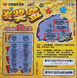 李先生是福利彩票的忠實(shí)粉絲,對(duì)福彩的玩法都很了解,尤其喜歡刮刮刮樂(lè),所以他對(duì)這個(gè)票種非常熟悉。他一邊刮獎(jiǎng)一邊調(diào)侃:“前四張?jiān)趺催@么不給力呀,怎么著來(lái)個(gè)小獎(jiǎng)鼓勵(lì)一下也不錯(cuò)啊,總不能啥都沒(méi)有吧,要是這樣的話可是有點(diǎn)失望啊。”說(shuō)話的同時(shí),他也將第五張的玩法一刮開(kāi)了。三個(gè)120000走進(jìn)了他的眼簾兒,剛開(kāi)始還不相信,于是,他請(qǐng)銷(xiāo)售員幫忙核實(shí)一下。當(dāng)銷(xiāo)售員拿過(guò)獎(jiǎng)票后就發(fā)現(xiàn)中獎(jiǎng)了:“李哥,恭喜啊,中大獎(jiǎng)啦!得請(qǐng)客噢!”李先生滿(mǎn)臉寫(xiě)著疑問(wèn):“真的假的?”“你再仔細(xì)看看,玩法一印著三個(gè)‘120000’元呢!”等李先生再次核實(shí)后才確認(rèn)自己的確中了頭獎(jiǎng),于是,他激動(dòng)地說(shuō):“得嘞,今晚我請(qǐng)客!”