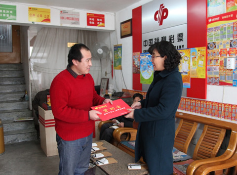 市福彩中心主任鞠傳軍(左)為投注站業主送去資助金