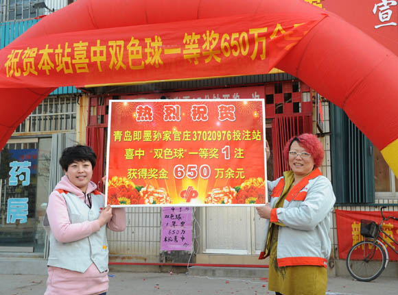近日,島城彩市春風送喜、“獎花”遍開。在剛剛過去的前兩月中,島城“雙色球”和“七樂彩”兩個玩法已累計中出5個高成色頭獎。3月4日晚,在“雙色球”第2014024期搖獎中,島城再收1注高達650萬余元的頭獎。得知站內育出“金花”,中獎站銷售員王紅雷風風火火地舉行了一個“升級版”的慶賀儀式。
