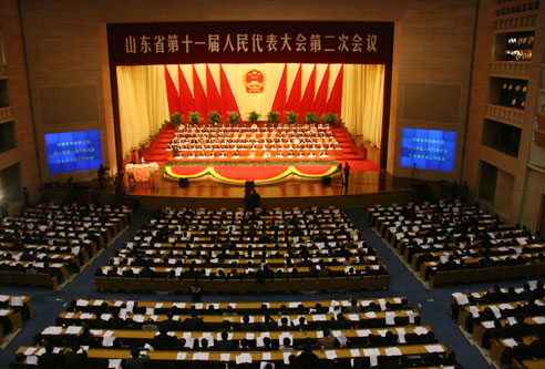 大眾網2月15日訊 今天下午三時,省十一屆人大二次會議舉行第二次全體會議,聽取省人大常委會工作報告和省“兩院”工作報告。圖為大會現場。