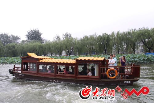 進入大名湖公園后,采訪團直接乘坐游船飽覽湖面美景,清水依依、荷葉顫顫、濟南特有的城市風情讓大家流連忘返,位于濟南市中心的大明湖是4A級景區,被譽為“泉城明珠”,同趵突泉、千佛山并稱濟南三大名勝。