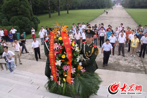 隨后,采訪團來位于臨沂城區(qū)金雀山腳下、沂河西岸的華東革命烈士陵園,該陵園是紀(jì)念在抗日戰(zhàn)爭和解放戰(zhàn)爭中犧牲的華東地區(qū)革命烈士而建,是華東地區(qū)最大的革命烈士陵園。園內(nèi)以45米高的五角燈塔式革命烈士紀(jì)念塔為中心,塔的東南方向有開國首席大將粟裕骨灰撒放處以及羅炳輝、國際共產(chǎn)主義戰(zhàn)士漢斯?希伯和王麓水墓,塔后是宮殿式烈士紀(jì)念堂,堂內(nèi)有表現(xiàn)烈士事跡的浮雕和鐫刻著61813位烈士英名的石碑。