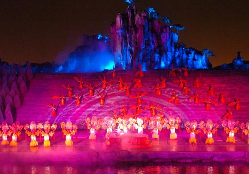 另外,這也江北第一部內河大型實景演出。千里沂河穿城而過,給臨沂增添了無窮的魅力和內涵。《蒙山沂水》的主舞臺就設在沂河中心島的水面上,觀眾席則設在島上。運用水幕影像、水霧、煙火及河面上的互動船只、水上漂浮道具、水上升降臺等現(xiàn)代藝術手段,使整場演出亦山亦水、如夢如幻。游客在中心島上或乘小船在槳聲燈影中欣賞河面燈船、水面蘭亭序、水中火線橋等,必定別有風味。