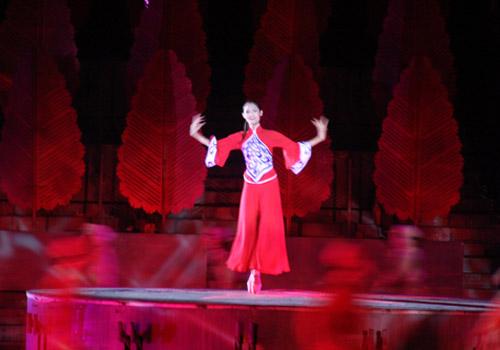 除了精彩的歌舞表演,現(xiàn)場的燈光也十分絢麗,激光燈的編織效果使夜色中的湖心島披上了如夢如幻的色彩。同時,燈光在舞臺上做出的微波蕩漾的藍色水面,更增加了奇妙感。
