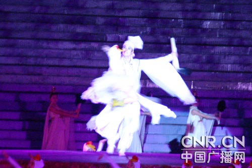 記者在現場看到,演出以噴泉水幕為屏幕,隨著巨大的水幕騰空而起,華美的燈光開始變幻,演員們身著華服出現在6000余平方米的舞臺上,伴隨著悠揚親切的歌聲翩翩起舞。在《沂蒙小調》歌舞表演之后,《地靈人杰》、《熱土情深》等表演依次亮相,為觀眾們帶來了一場絢麗壯觀、唯美抒情的視覺盛宴。《地靈人杰》中王羲之扮演者著一襲白衣,飄逸起舞,引起現場觀眾陣陣掌聲。