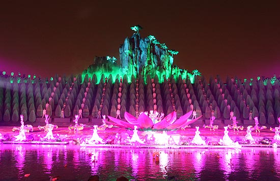 記者在現(xiàn)場看到,演出以噴泉水幕為屏幕,隨著巨大的水幕騰空而起,華美的燈光開始變幻,演員們身著華服出現(xiàn)在6000余平方米的舞臺上,伴隨著悠揚親切的歌聲翩翩起舞。在《沂蒙小調(diào)》歌舞表演之后,《地靈人杰》、《熱土情深》等表演依次亮相,為觀眾們帶來了一場絢麗壯觀、唯美抒情的視覺盛宴。