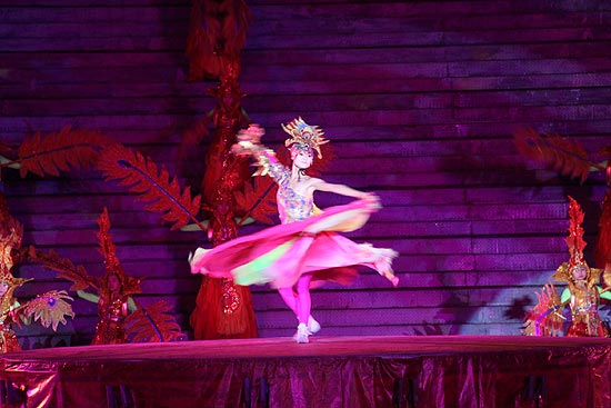 除了精彩的歌舞表演,現(xiàn)場的燈光也十分絢麗,激光燈的編織效果使夜色中的湖心島披上了如夢如幻的色彩。同時,燈光在舞臺上做出的微波蕩漾的藍(lán)色水面,更增加了奇妙感。