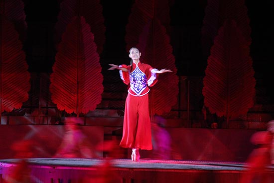 從水中走來,從悠遠(yuǎn)的歷史中走來。晚上8點,沂河湖心北島上燈光絢麗,伴隨著我們所熟悉的沂蒙山小調(diào),演員們開始了極具創(chuàng)意和現(xiàn)代科技色彩的歌舞表演,一場震撼人心的大型水上實景演出正式開演。