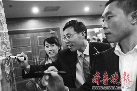 浪潮集團董事長兼CEO孫丕恕等企業家在簽名板上簽名。本報記者 陳文進 攝 |